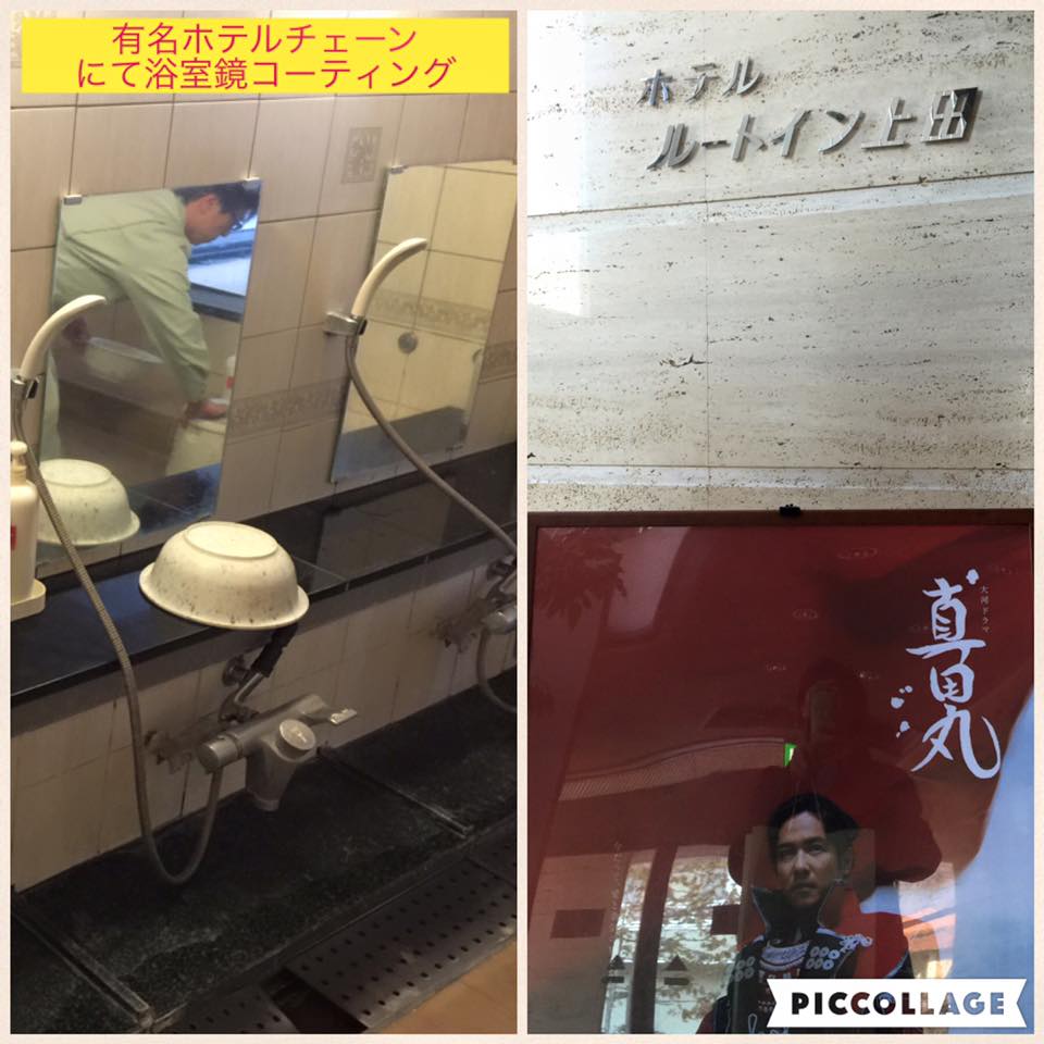有名ホテルチェーンの浴室の鏡に施工中